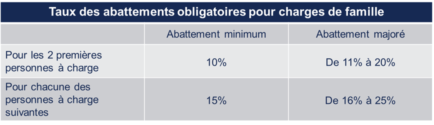 Le taux minimum d’abattement est fixé par la loi à 10% pour les 2 premières personnes à charge puis à 15% pour les personnes à charge suivantes.