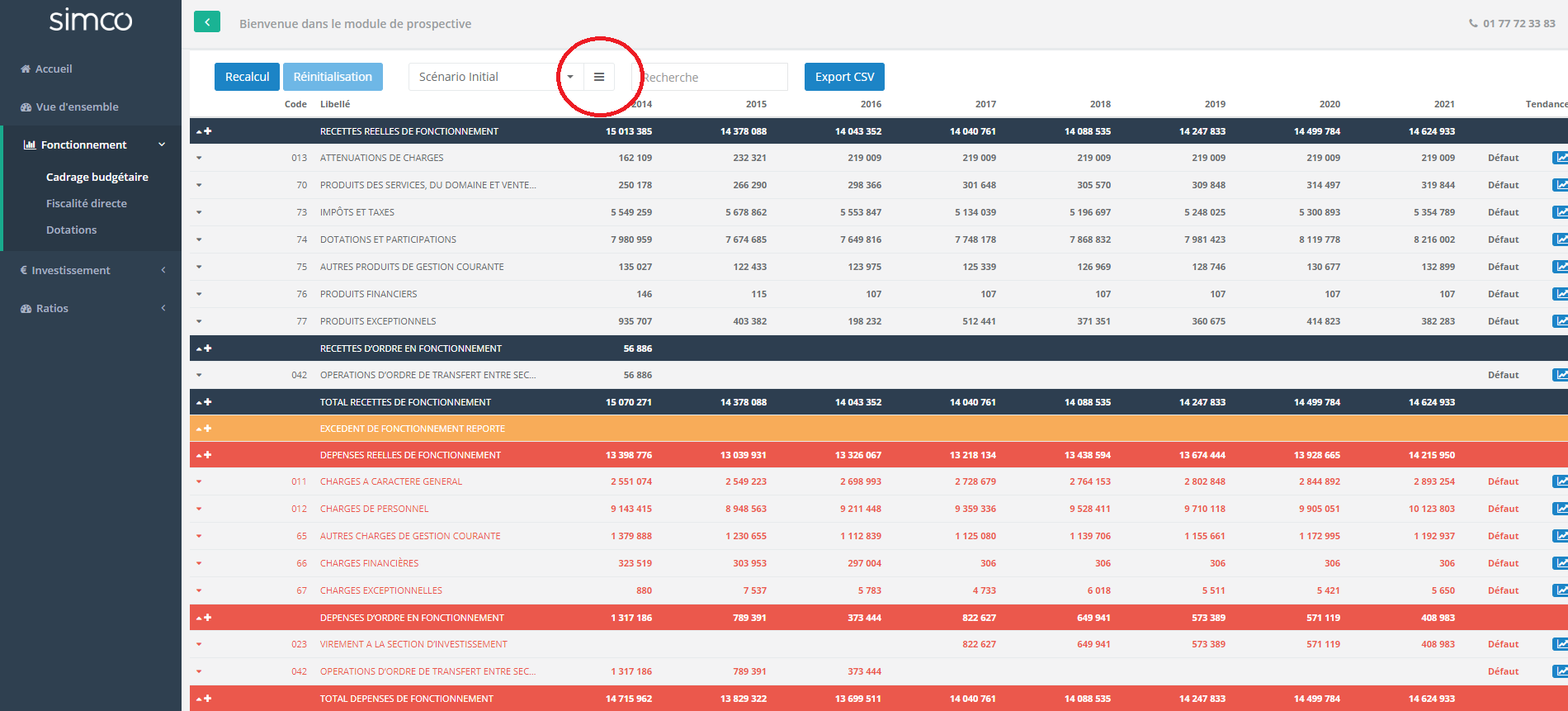 Pour créer votre prospective, vous devez créer un scénario. Le scénario initial, toujours présent dans le module, vous présentera une vue de votre santé financière sans aucune modification et avec les tendances d’évolution que nous avons retenu pour chaque chapitre.