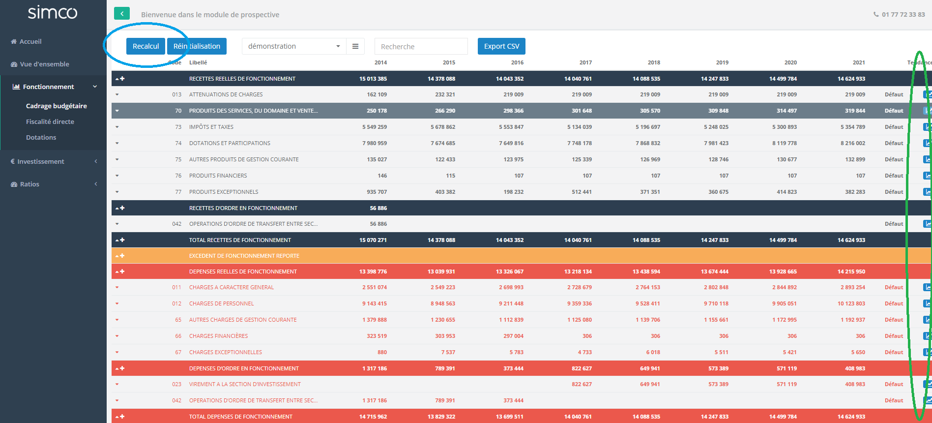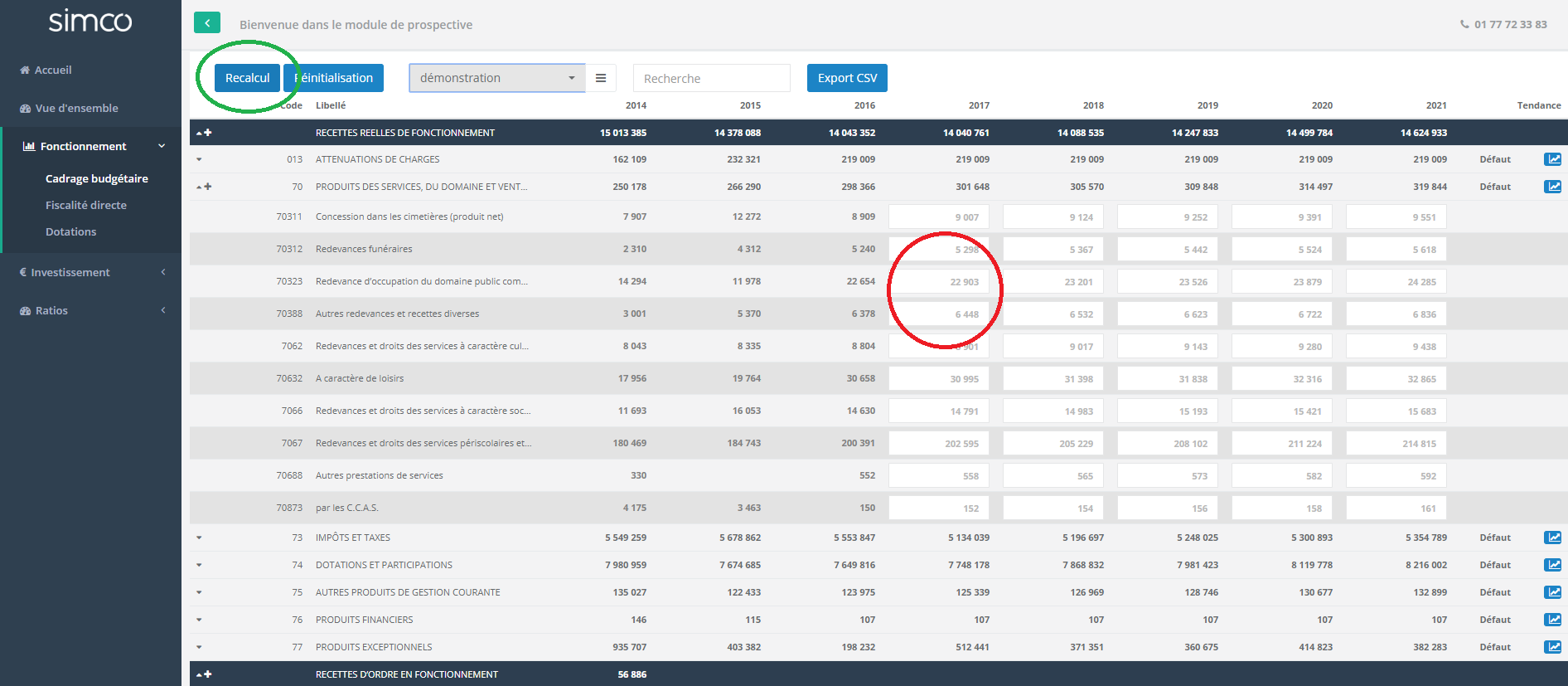 Une fois votre tendance inscrite, il vous suffit de calculer sur le bouton « recalcul » (entouré en bleu) afin d’enregistrer votre modification et procéder au calcul en temps réel.