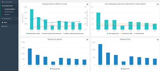 Dix ratios d’analyse financière vous sont présentés dans le module de prospective afin de vous permettre de constater en temps réel de l’impact de vos modifications et décisions sur la santé et la solvabilité financière de votre Collectivité. Pour y avoir accès, il vous suffit de cliquer sur l’onglet « Ratios » dans le menu latéral de gauche.